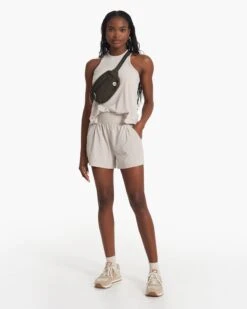 Whether you are working out or just kicking back, keep it relaxed in silky soft, performance stretch fabric. An easy companion to the Villa Shorts and Wide-leg pants, this racer tank is moisture wicking and naturally wrinkle free. Made with partly recycled material.